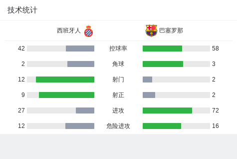 下半场开始后,西班牙人并未松懈,阿尔曼萨在第51分钟完成一次漂亮的个人进球,使得比分扩大到5-0。巴塞罗那在全场比赛中始终无法找回状态,未能构建有效的攻势。